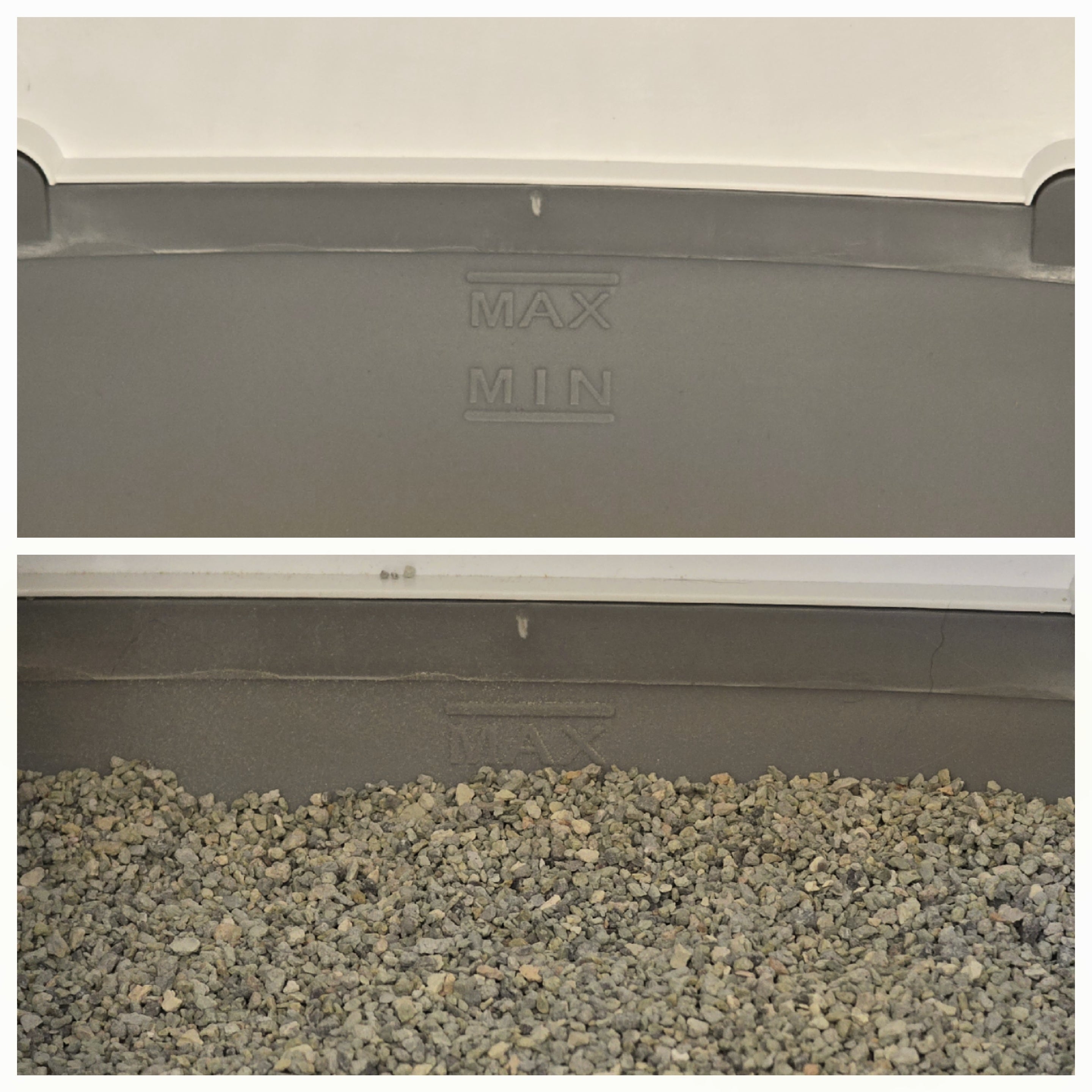 Fülle nun die Streu in DasKlo und achte auf die "min" und "max" Markierung am hinteren Teil des Bodens.